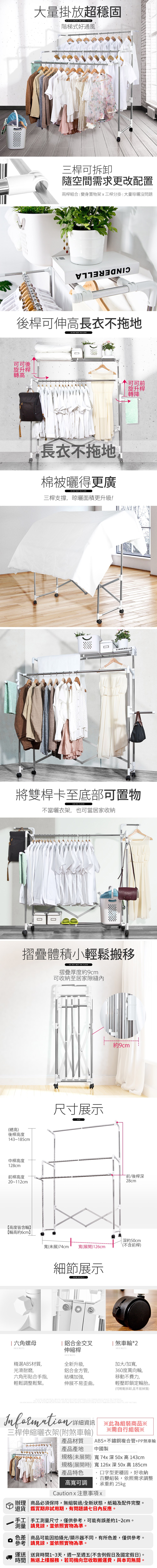 【晴天媽咪】不鏽鋼多功能三桿伸縮曬衣架(附滾輪)
