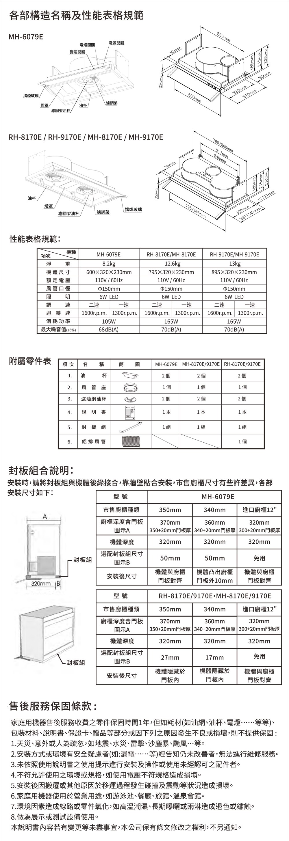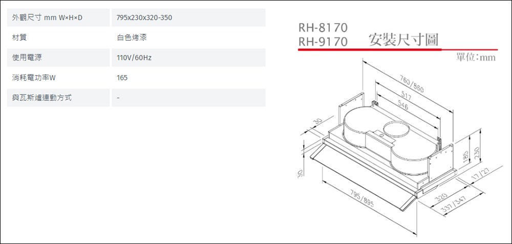 林內 Rinnai 隱藏式專利設計電熱除油排油煙機 W80CM 型號MH-8170E