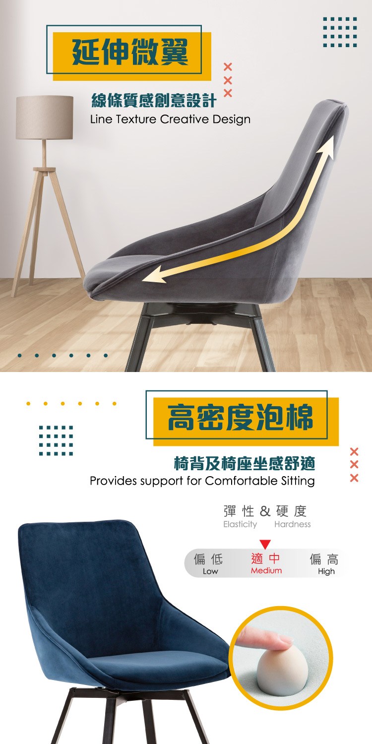 延伸的微翼設計,線條質感創意,高密度泡棉椅背及椅座坐感舒適,椅座可彈性154°旋轉,靈活應用,