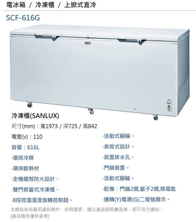 SANLUX台灣三洋 616公升上掀式冷凍櫃 SCF-616G~含拆箱定位