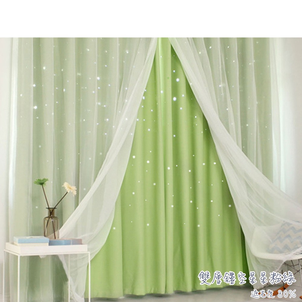 【小銅板】雙層浪漫白紗鏤空星星窗簾-單片寬200*高270-1片入粉綠