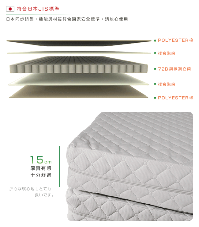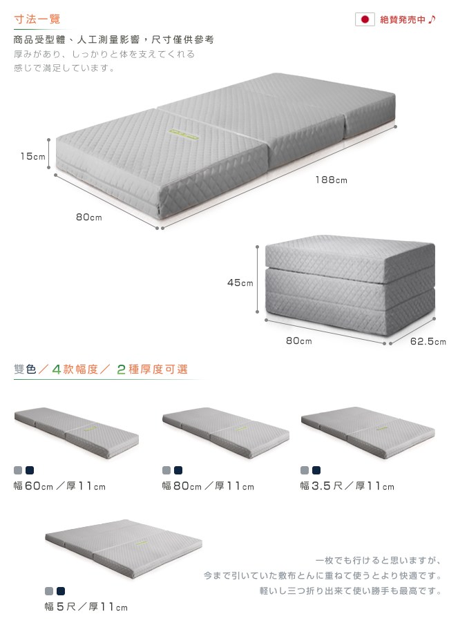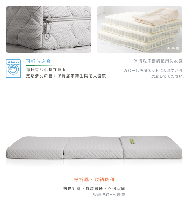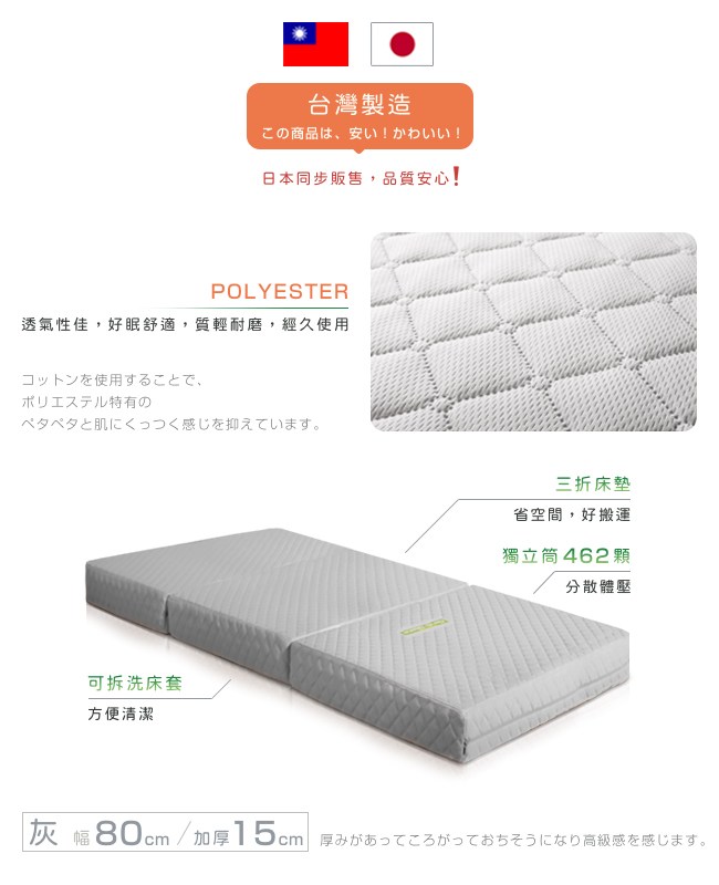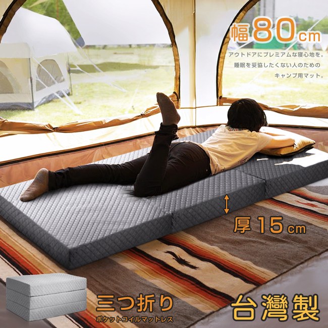 台灣製造,日本同步販售,品質安心。三折設計,展開、折疊床墊,快速、簡單佈置完成。床墊厚度15cm,加厚設計,躺在床上舒舒服服,享受沈睡的好眠。對於家裡的臥房、客房、兒童房來說,展開就是一張床,折疊起來就是一個座墊。POLYESTER 棉,透氣性佳,好睡舒適,質輕耐磨,經久使用。依據CNS 7447國家標準,72B鋼線獨立筒,具備韌性佳、結構強、耐用久,用於獨立筒床墊是最舒適的硬度。獨立的彈簧,分散體壓,各別配合身形而下沉,保持自然的睡姿,減輕骨骼的壓力。可拆洗床套,定期清潔,可避免塵蟎、細菌或過敏原滋生,保持居家衛生。