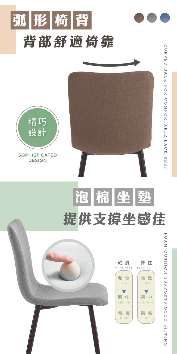 精巧弧形椅背,讓背部舒適倚靠,搭配泡棉坐墊、提供支撐坐感佳,木紋熱轉印金屬椅腳、穩固耐用,