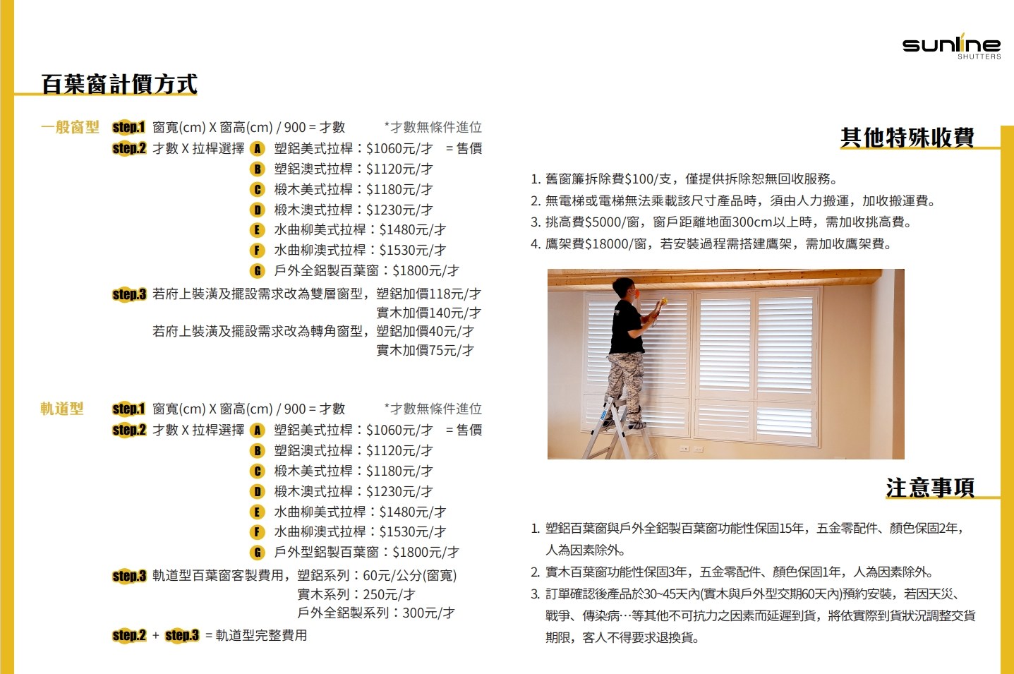 2. 窗型以才數計價, 基本才20才(不足20才以20才計價)。軌道型加價以實際施作面積的寬度(公分)計算。