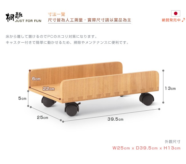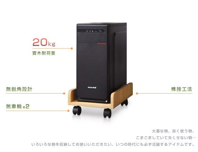 實木厚1.5cm,耐荷重20kg,厚實、經久使用,可放置各款電腦主機。貼心的無銳角設計,讓經常使用的您防刮手與碰撞,避免受傷。移動輪讓主機架推移、迴轉順暢自如,方便打掃,清潔環境。煞車輪往下壓扣,即可鎖定不移動。