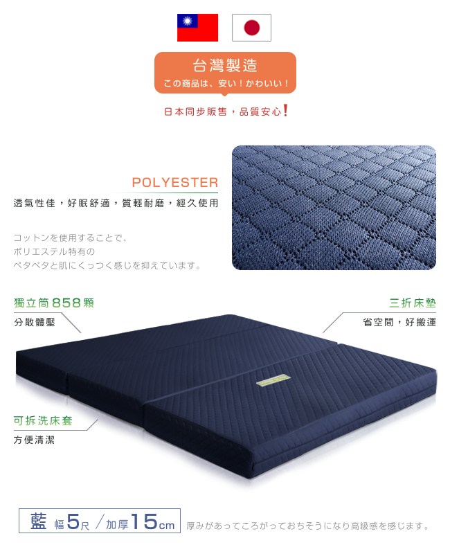 台灣製造,日本同步販售,品質安心。三折設計,展開、折疊床墊,快速、簡單佈置完成。床墊厚度15cm,加厚設計,躺在床上舒舒服服,享受沈睡的好眠。對於家裡的臥房、客房、兒童房來說,展開就是一張床,折疊起來就是一個座墊。POLYESTER 棉,透氣性佳,好睡舒適,質輕耐磨,經久使用。依據CNS 7447國家標準,72B鋼線獨立筒,具備韌性佳、結構強、耐用久,用於獨立筒床墊是最舒適的硬度。獨立的彈簧,分散體壓,各別配合身形而下沉,保持自然的睡姿,減輕骨骼的壓力。可拆洗床套,定期清潔,可避免塵蟎、細菌或過敏原滋生,保持居家衛生。