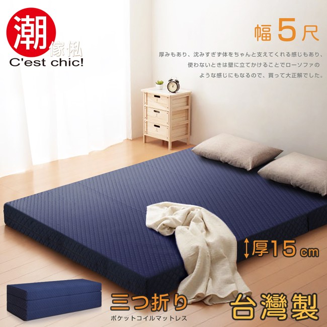 【C'est Chic】二代目日式三折獨立筒彈簧床墊5尺(加厚)-藍
