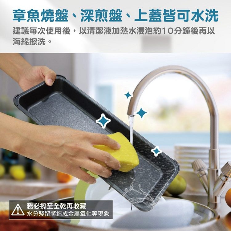 3. 章魚燒盤、深煎盤、上蓋清洗完畢後,務必擦至全乾再收藏,