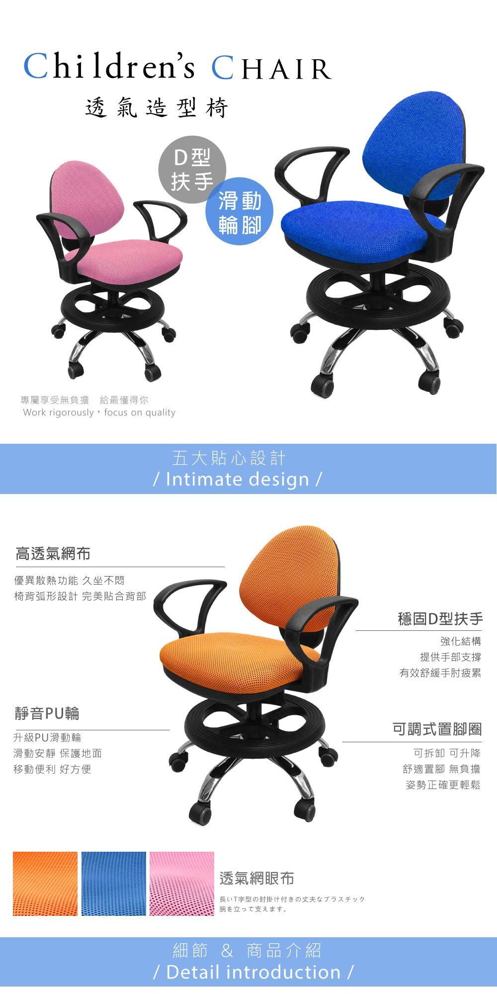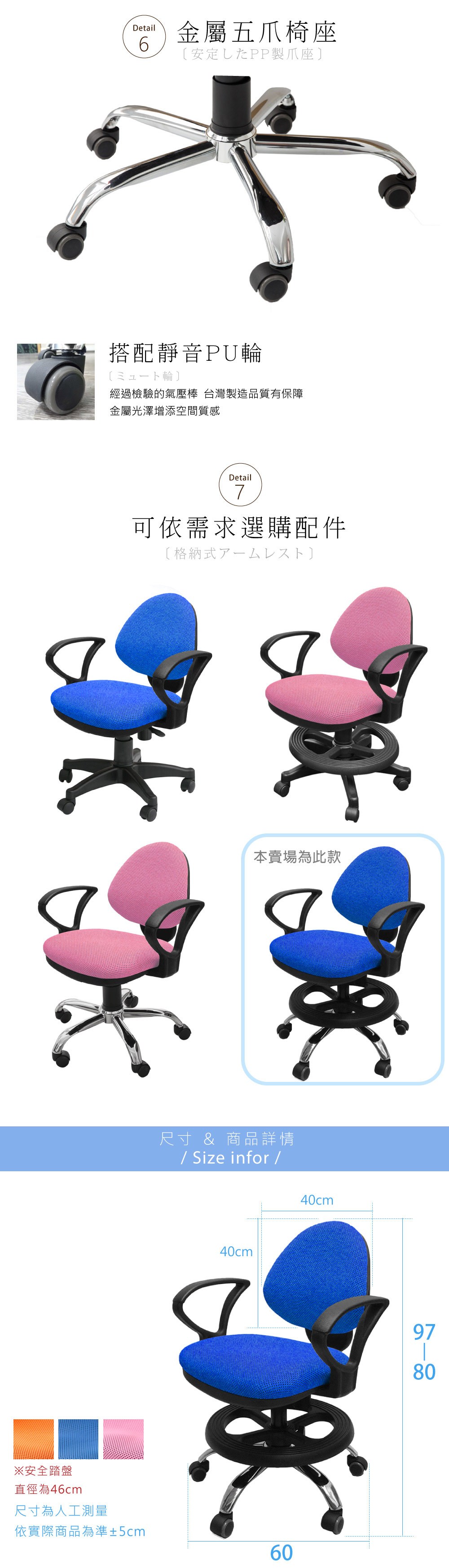 【A1】漢妮多彩固定式D扶手鐵腳兒童成長電腦椅1入(箱裝出貨)藍色