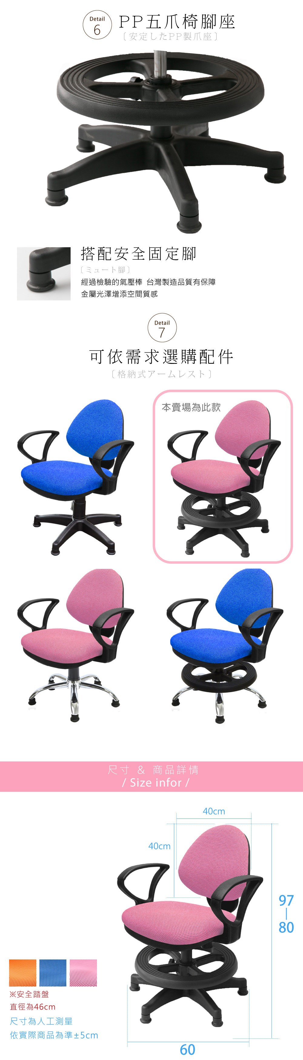 【A1】漢妮多彩活動式D扶手鐵腳兒童成長電腦椅1入(箱裝出貨)粉紅色