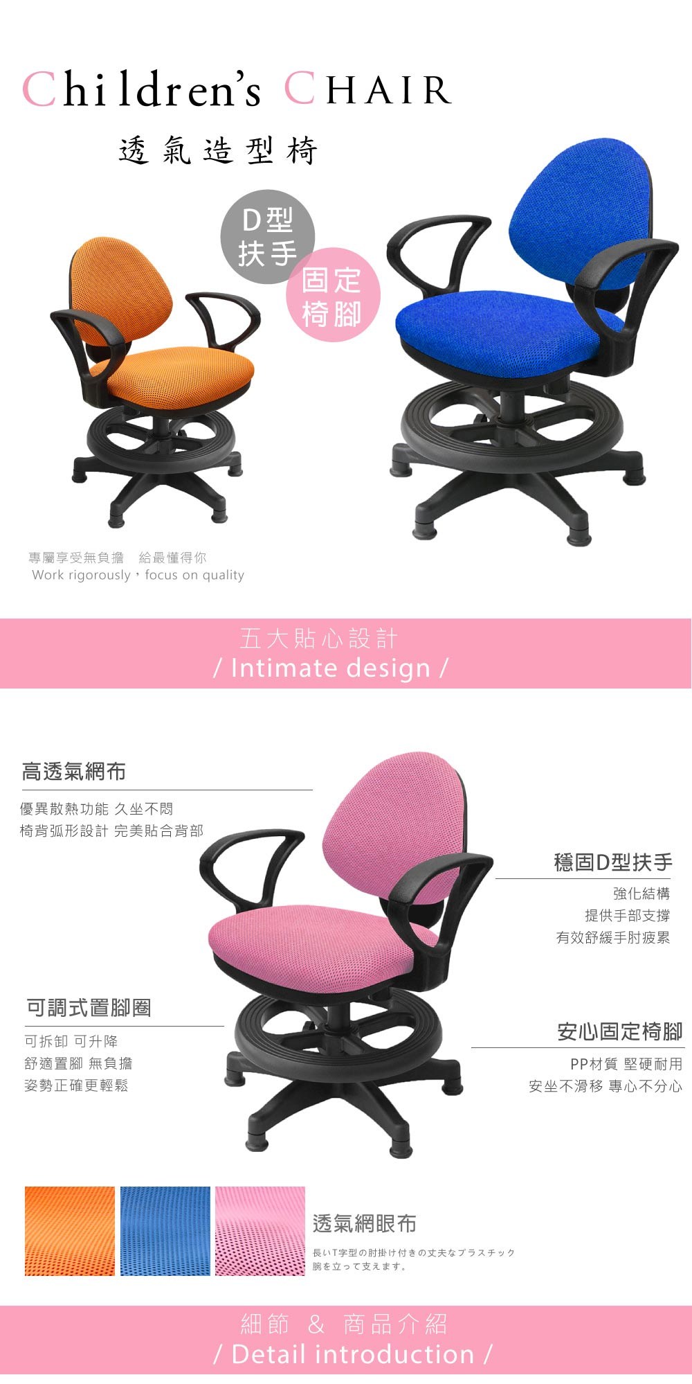 【A1】漢妮多彩活動式D扶手兒童成長電腦椅-1入(箱裝出貨)粉紅色
