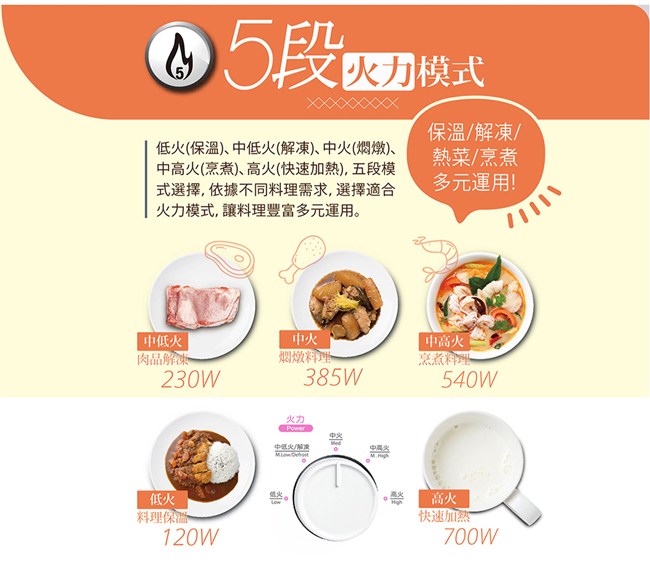 *5段火力模式:低火(保溫),中低火(解凍),中火(悶燉),中高火(烹煮),高火(快速加熱)