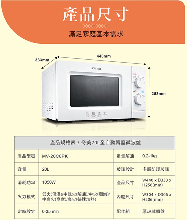 CHIMEI 奇美 25公升 機械式 平台微波爐 MV-25C1FK 微加幸福 無盤大空間設計