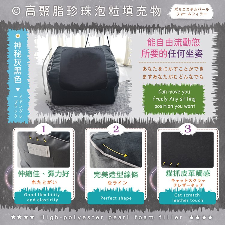 高聚脂珍珠泡粒填充物是今年日本最流行的材質,能自由流動配合您所要的任何坐姿。