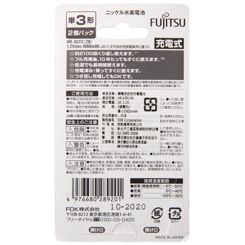 富士通Fujitsu 4號高容量低自放鎳氫充電電池/960mAh/4號/2入卡