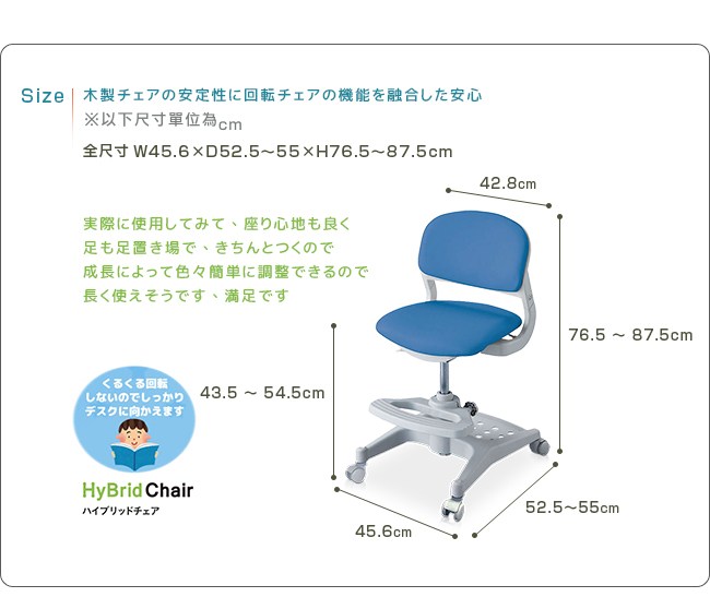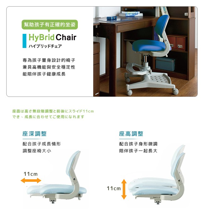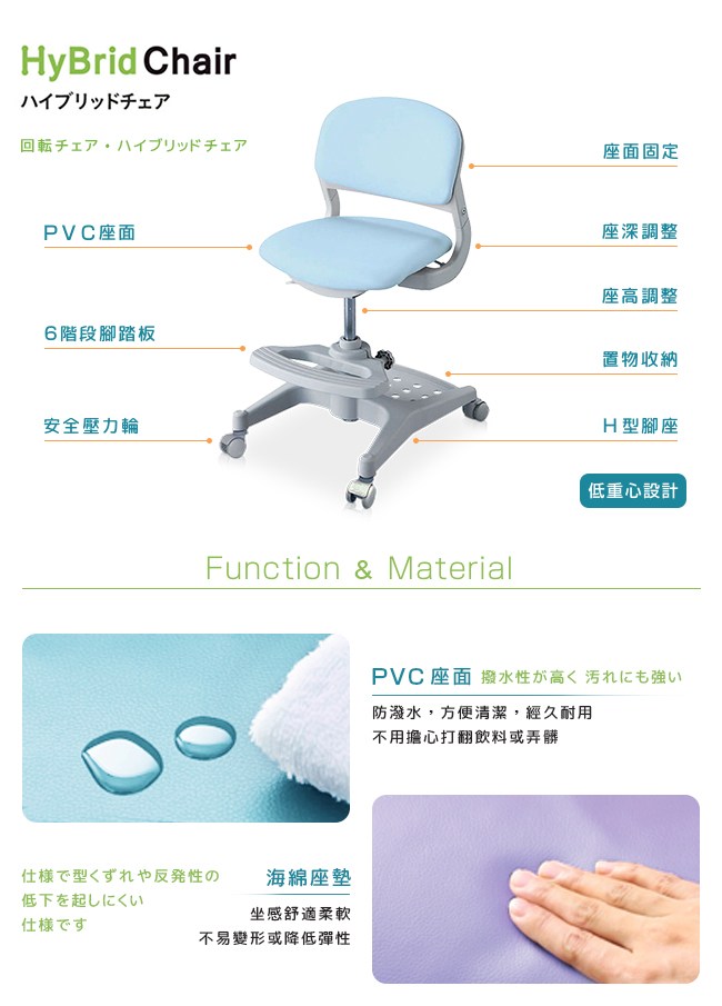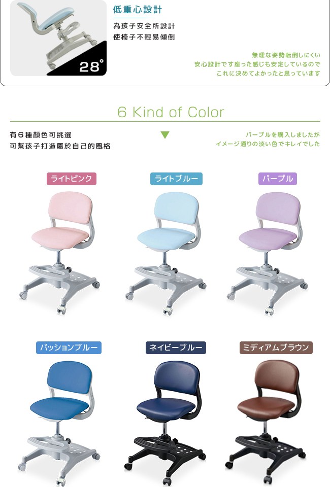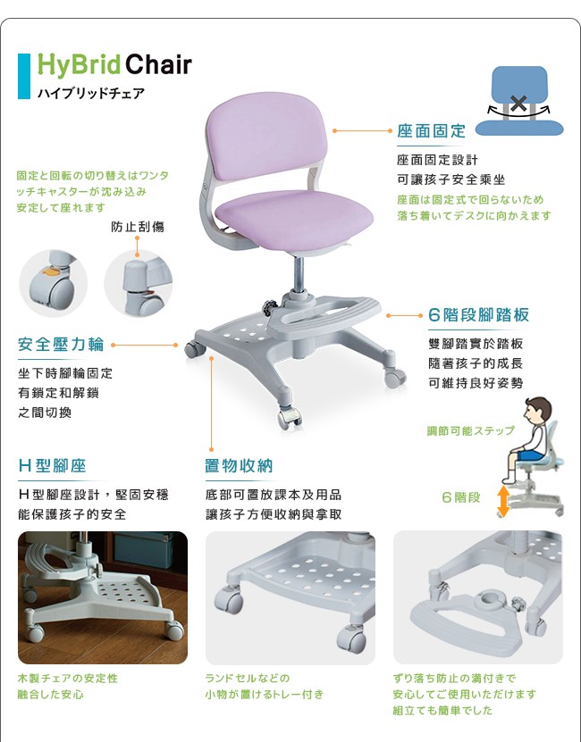 注重安全與可靠性的學童椅,微調座深、座高的機能,讓孩子從小用到大。座面固定不旋轉與壓力輪設計,卓越的安定性,父母可以安心給小孩使用。座墊有出色的彈力、耐用度與貼身性,坐感舒適,經久耐用。腳踏板6段高調整,確保孩子的雙腳踩得踏實,並且保持正確的坐姿,擁有良好的成長發育。獨特的H型尼龍腳座,座椅下方可放置書包,不佔空間、收納有效率。