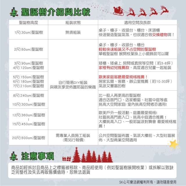 ※請注意"尺(呎)"乃一般聖誕樹業界的高度單位(一尺約30cm), 其一般高度定義為從底座底部地上一直到樹頂星的樹藤向上全部拉直到最頂部的垂直高度 有可能因為放置樹頂星或頂部樹藤沒有向上拉直而導致高度的減少*