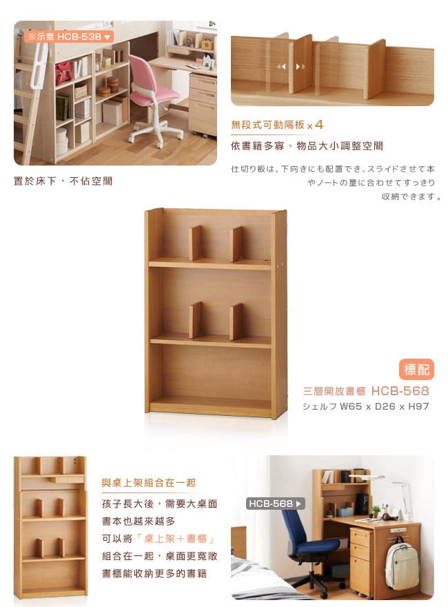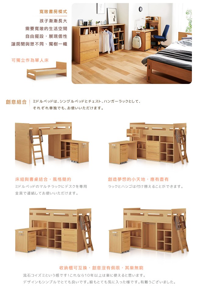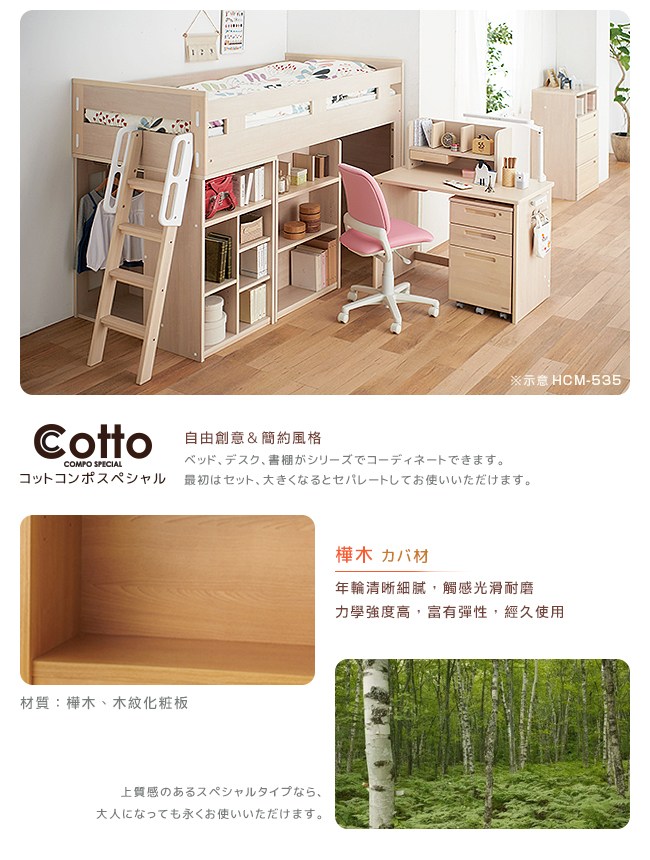 小孩在不同的階段,想法會有所改變,對於房間的格局,也不會一成不變。當孩子長大後,需要大桌面,那麼桌上架就可以與書櫃組合,桌面更寬敞,書櫃也能擺放更多的書本;也能與床架結合,成為一個精緻的收納展示台。空間雖然有限,但創意沒有侷限。Cotto書房系列,可組合、獨立使用,讓孩子決定風格,喜愛自己的房間,豐富親子的快樂時光。