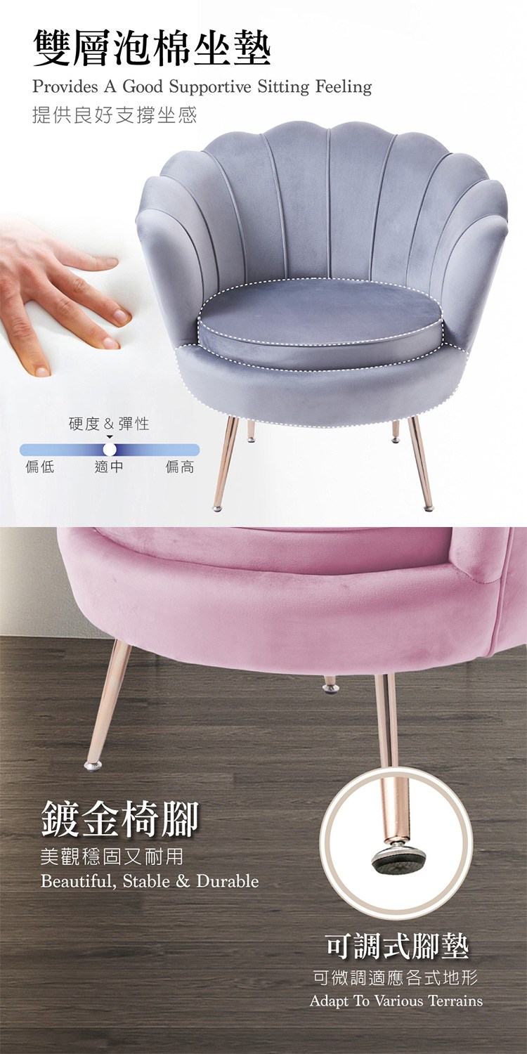 極富美感,寬敞厚實可舒適椅靠,雙層泡棉坐墊提供良好支撐坐感,金屬鍍金椅腳,美觀穩固又耐用,