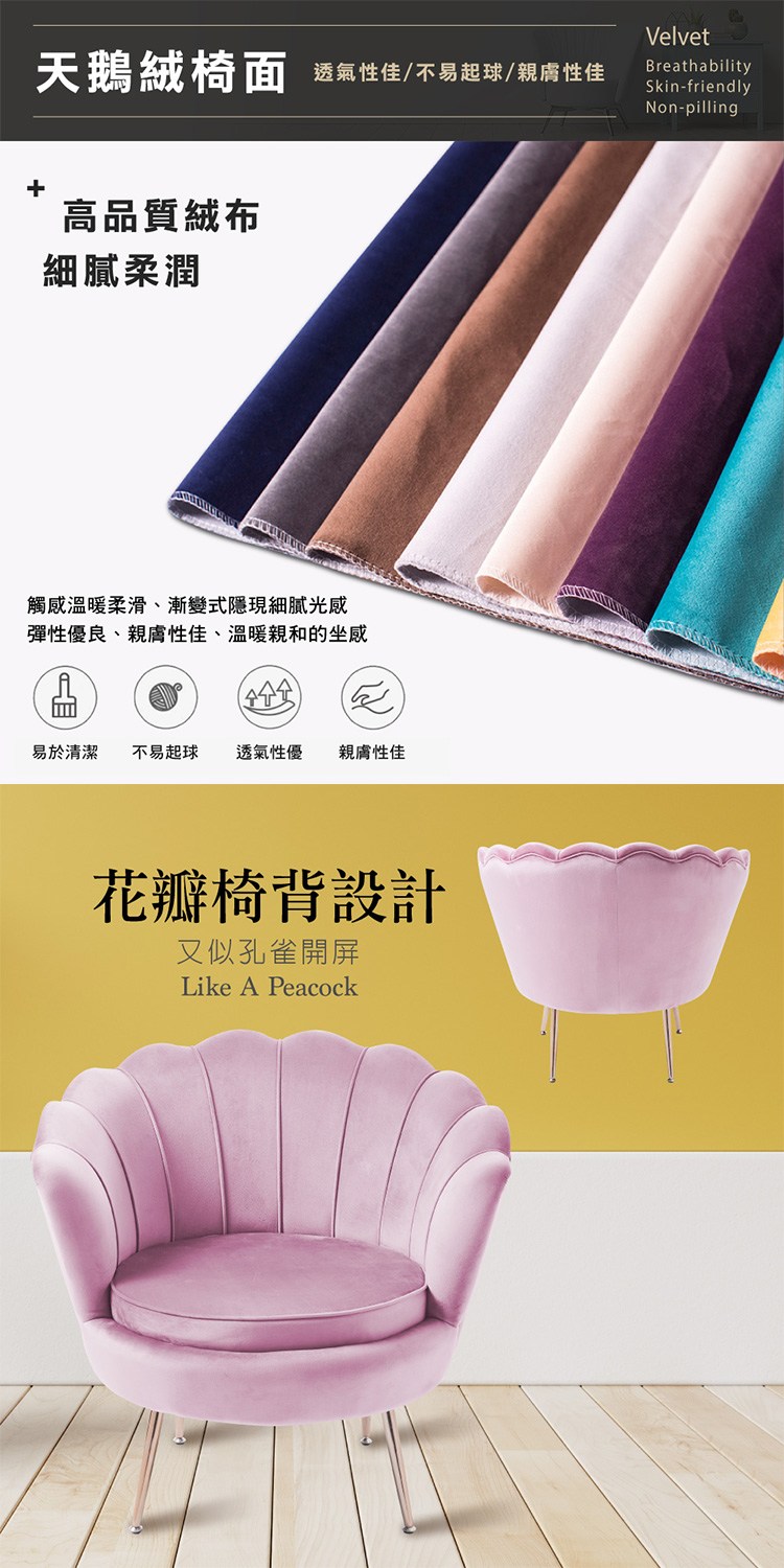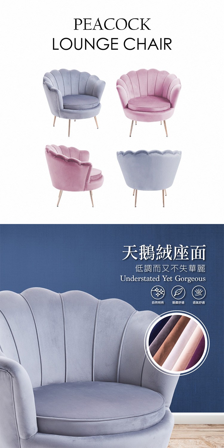 台灣與歐美同步販售、美規設計,低調而又不失華麗的天鵝絨座面,花瓣綻放椅背設計又似孔雀開屏,