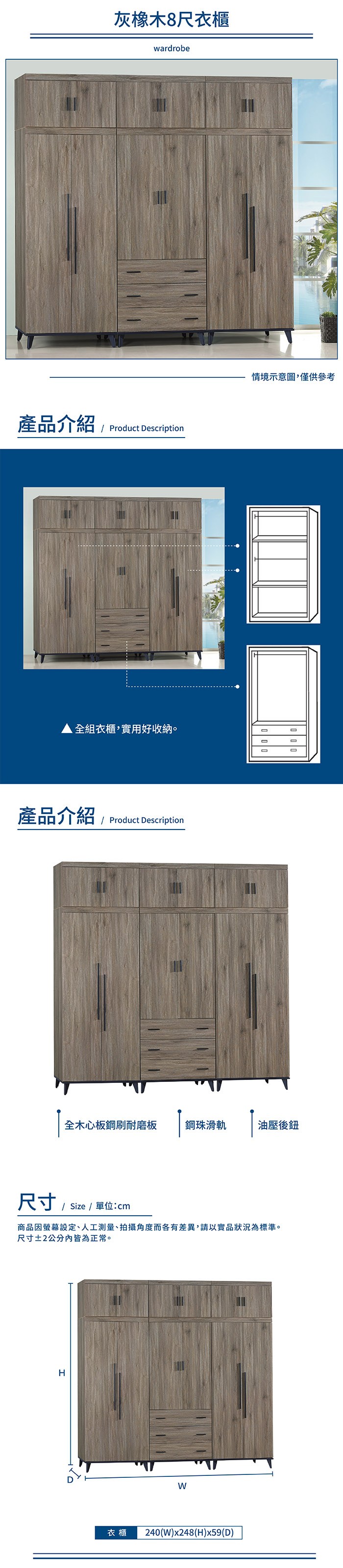 傢俱工場-芮茲 灰橡木8尺衣櫃