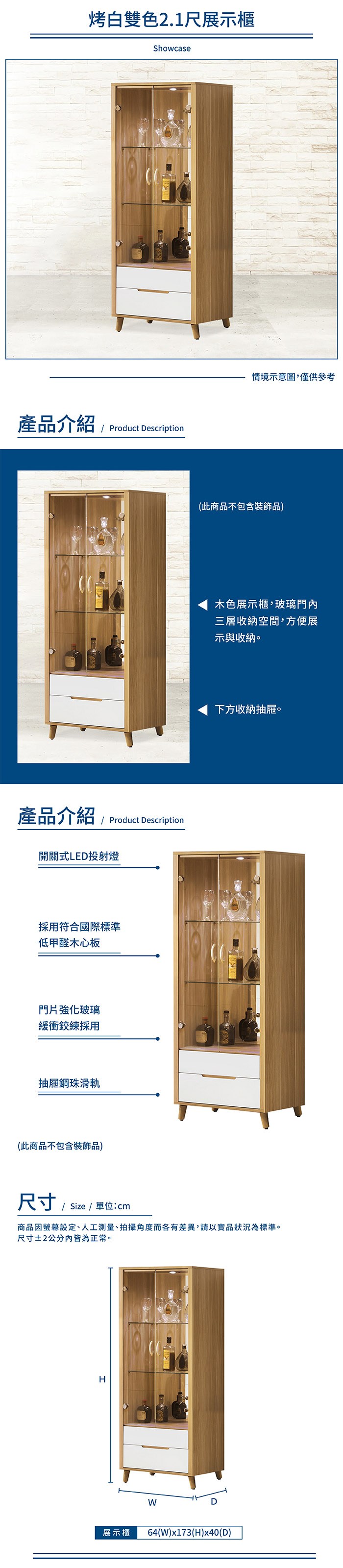 時尚屋 肯詩特烤白雙色2.1尺展示櫃 寬64x深40x高172.7cm