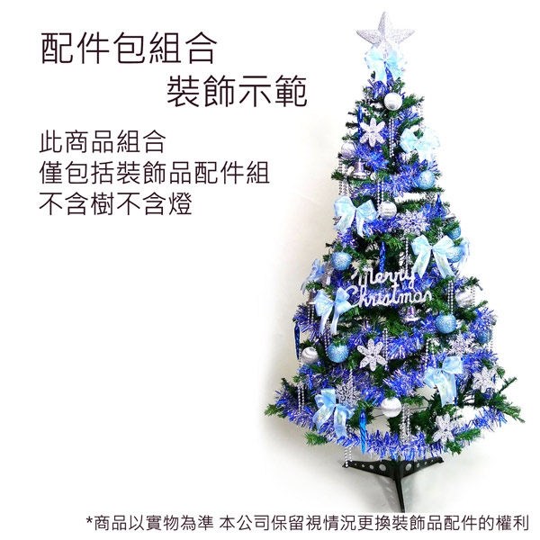 配件內容包括: 樹頂星 / Merry Christmas英文字 / 耶誕彩條龍柱/ 精緻蝴蝶結 / 電鍍吊飾/ 吊飾球等等 (共計150件配件)