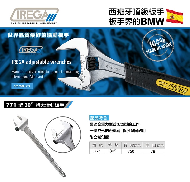IREGA 管鉗兩用活動板手 超強咬合力 加強鉻釩鋼 附公制、英制雙面刻度 西班牙製造 1支