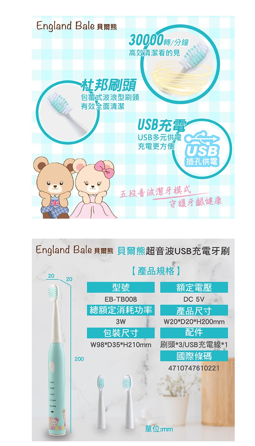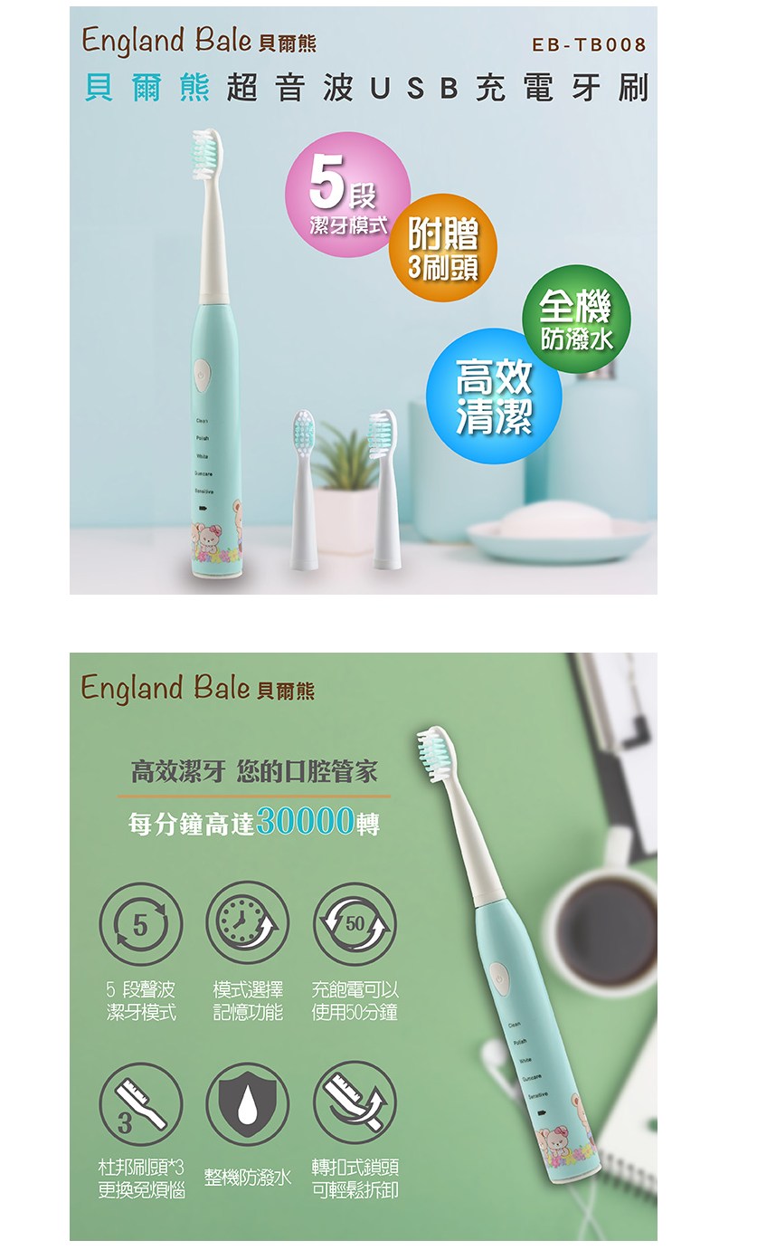 英國 貝爾熊超聲波 USB充電牙刷 EB-TB008