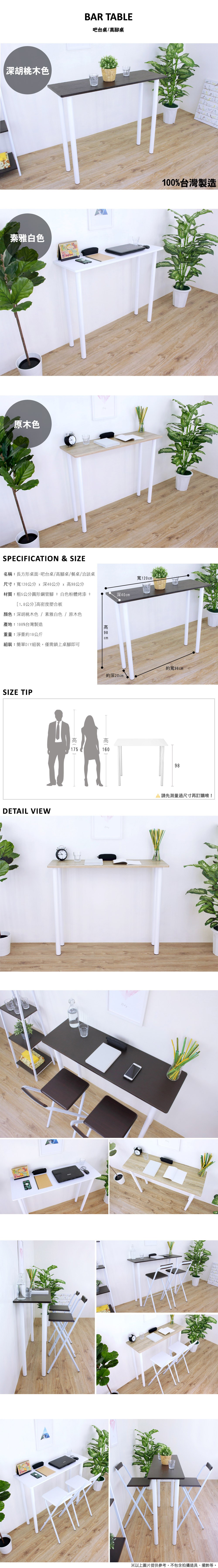 ◆小桌面[40公分x120公分]長方形高腳桌/吧台桌,桌角設計為圓弧型,使整體造型無銳角。