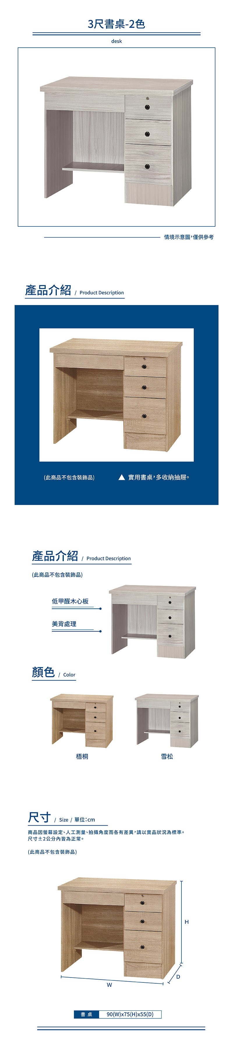 【AS】克利夫四抽3尺書桌-90x55x75cm(有三色可選)