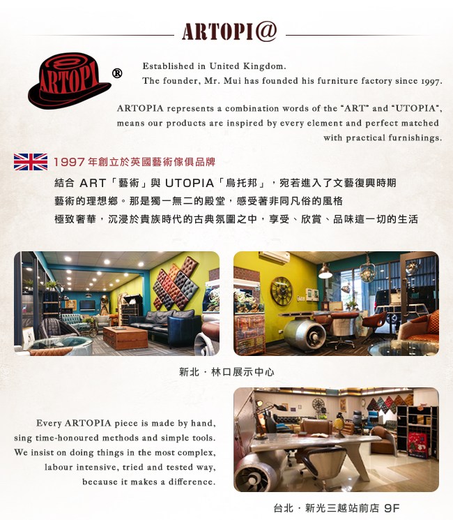 在對古董、復古傢俱的熱愛下,於 1997 年成立英國藝術傢俱品牌。結合「ART」藝術與「UTOPIA」烏托邦,宛若進入文藝復興時期,藝術的理想鄉。那是獨一無二的殿堂,感受著非同凡俗的風格。極致奢華,沈浸於貴族時代的古典氛圍之中,享受、欣賞、品味這一切的生活。