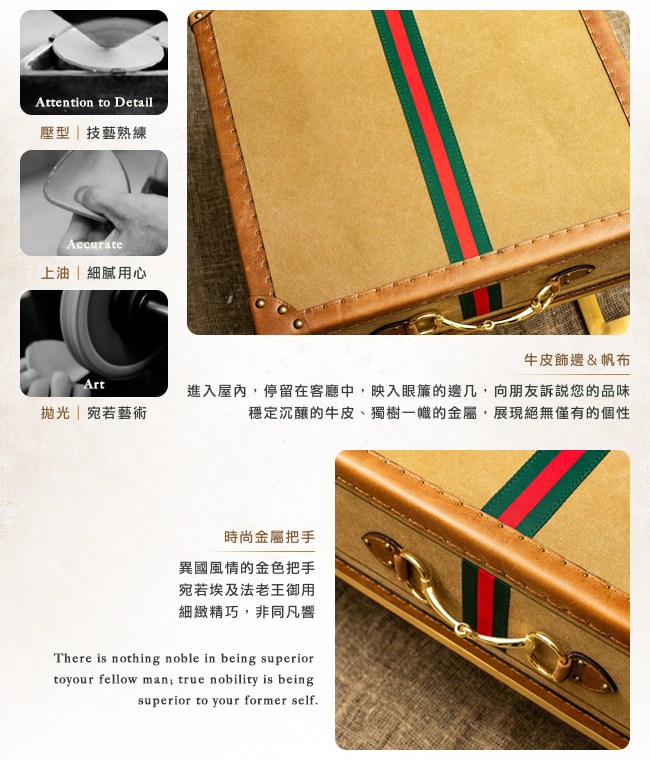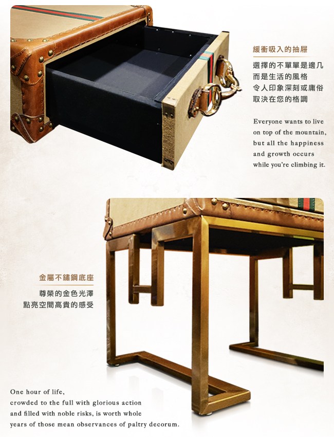 進入屋內,停留在客廳一會,映入眼簾的邊几,向朋友訴說您的品味。穩定沉釀的牛皮,獨樹一幟的金屬,展現絕無僅有的個性。奢華的巴西頭層厚牛皮飾邊,小麥色的帆布,與異國風情的時尚金屬把手,宛若埃及法老王御用的傢俱,細緻精巧,非同凡響。抽屜的緩衝吸入功能,專注細節的設計,您選擇的不單單是邊几,而是生活的風格,令人印象深刻或是庸俗,取決在您的格調。金屬不鏽鋼底座,尊榮的金色光澤,點亮空間高貴的感受。