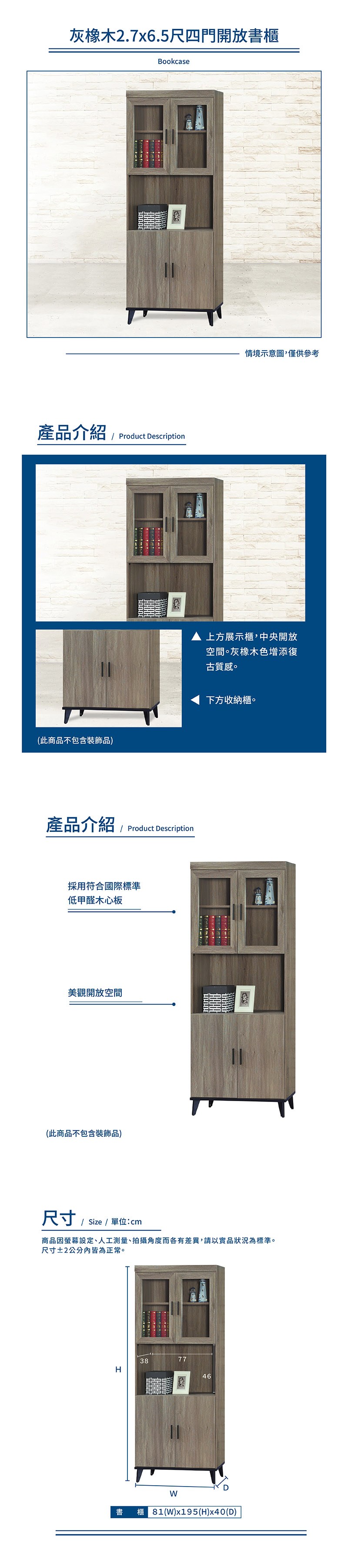 傢俱工場-芮茲 灰橡木2.7x6.5尺四門開放書櫃