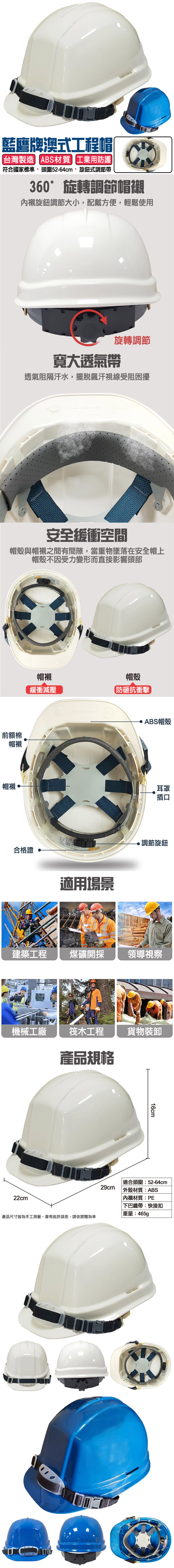 BLUE EAGLE 藍鷹牌 澳式工程帽 ABS外殼 PE內襯 快接扣下巴織帶 重量465g 29 x 22 x 16cm(適合頭圍52~64cm) 藍色 1個