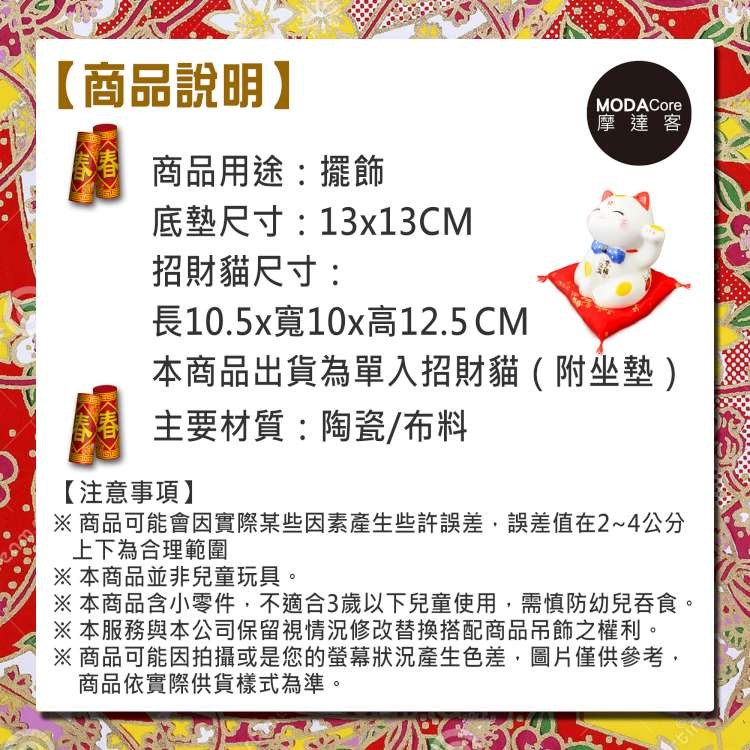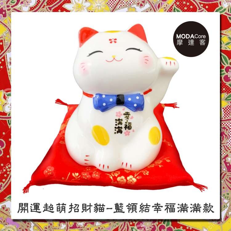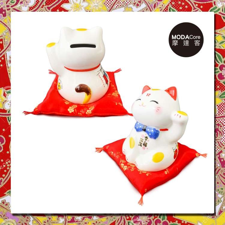 摩達客-農曆新年春節◉開運超萌陶瓷招財貓-粉領結招財進寶款/撲滿存錢桶擺飾桌飾(含坐墊)