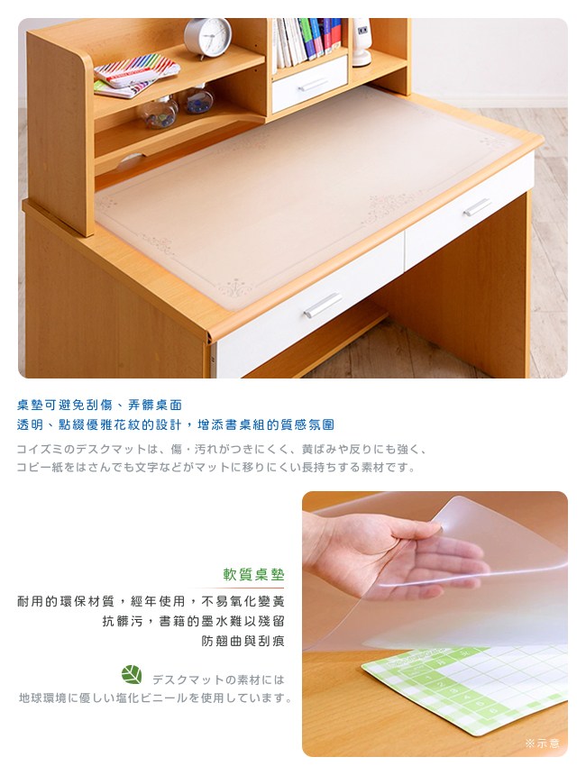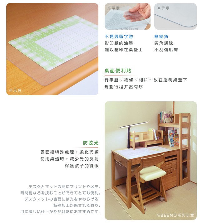 若僅僅是透明桌墊,略顯單調了些。設計精緻花紋飾邊,增添書桌組的質感氛圍。軟質桌墊,耐用的環保材質,不易氧化變黃。抗髒污,書籍或影印紙的油墨難以殘留、壓印在桌墊上。無銳角邊緣,不刮傷肌膚。可作為桌面便利貼,行事曆、紙條、相片⋯放在透明桌墊下,規劃行程井然有序。「防眩光」表面經過特殊處理,柔化光線。使用桌燈時,減少光的反射,保護孩子的雙眼。
