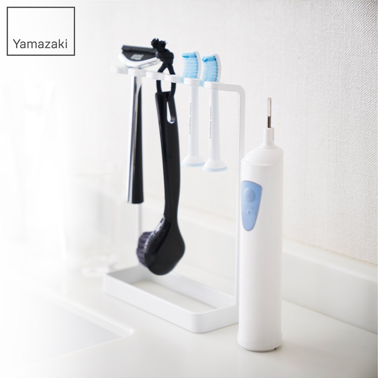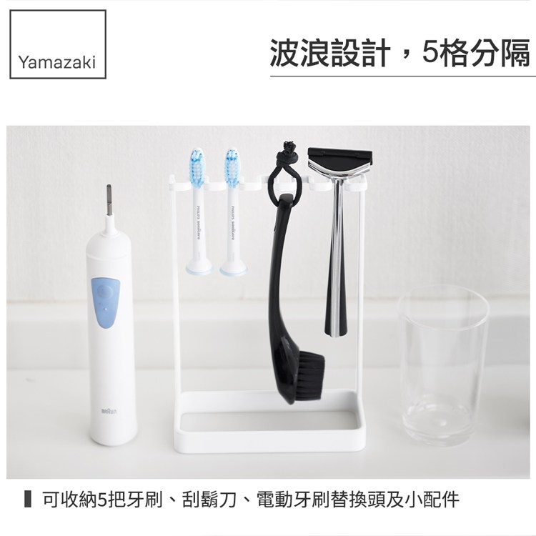 波浪身形巧妙收納5把牙刷、刮鬍刀、電動牙刷替換頭及小配件,還能輕鬆掛上沐浴球等掛具。