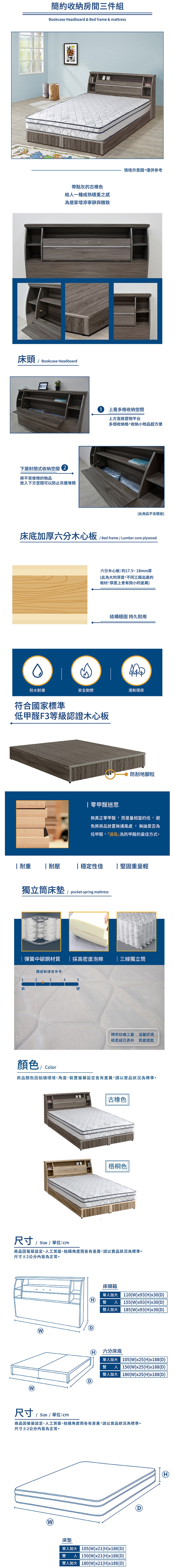 傢俱工場-派蒙 簡約收納房間3件組(床頭箱+床墊+六分床底)-雙大6尺古橡