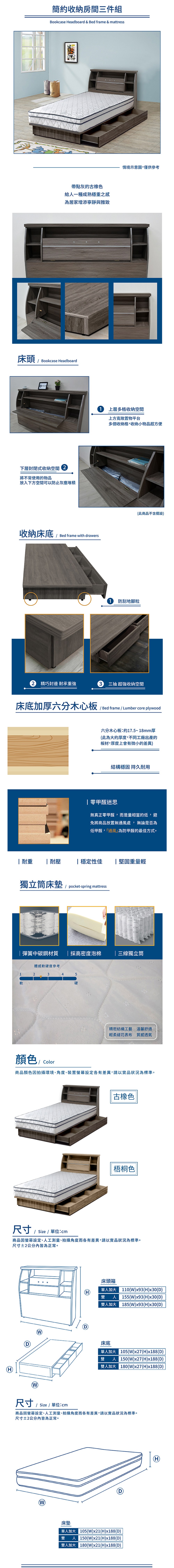 傢俱工場-派蒙 房間4件組(床頭箱+墊+三抽收納+邊櫃)-單大3.5尺古橡