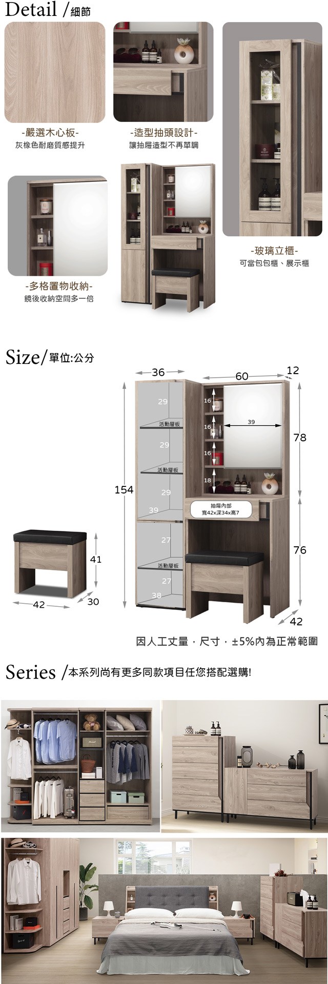 AS雅司-納茲橡木2尺鏡台-含椅-62*46*170cm