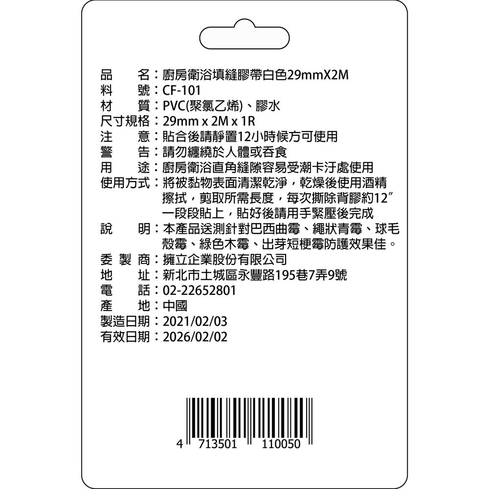 廚房衛浴防霉填縫膠帶 白色 29mmx2M