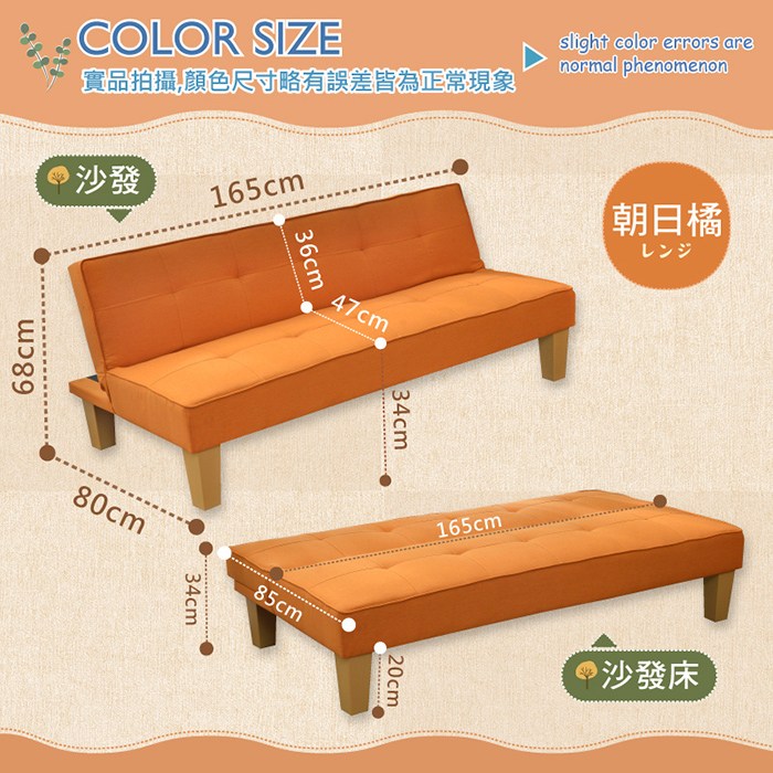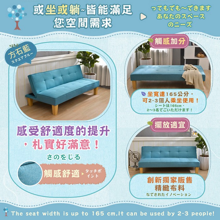 品名 【布可思議‧布沙發床椅】 尺寸 (椅):長 165*寬 80*高 68cm、坐高 34cm、坐深 47cm、背高 36公分、坐高 34公分、椅腳高 20公分 (床):長 165*寬 85*高 68cm