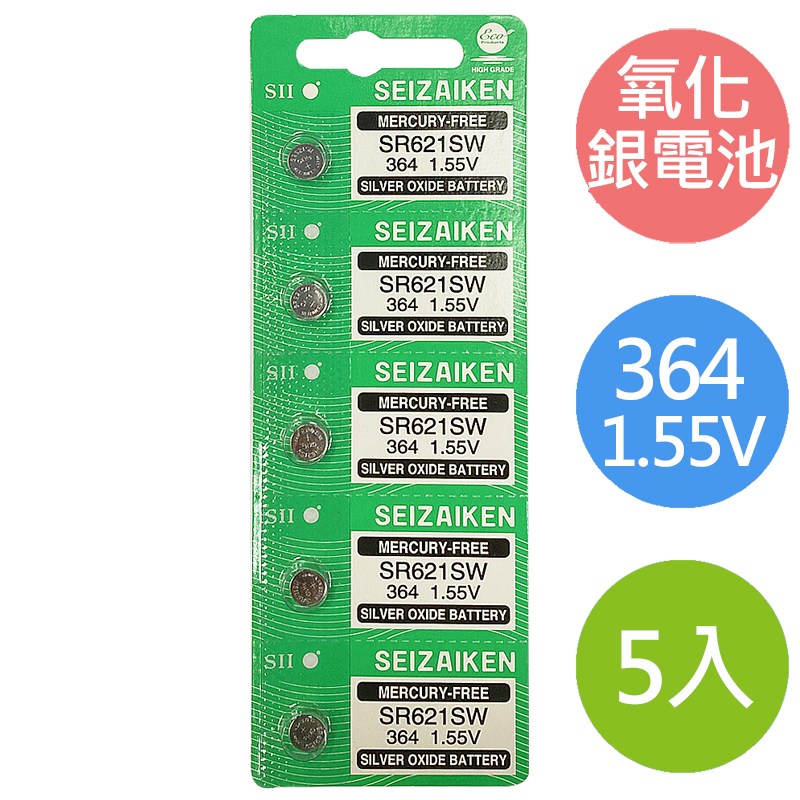 SII日本製SR621SW 鈕扣型無汞氧化銀電池 (364) 5顆