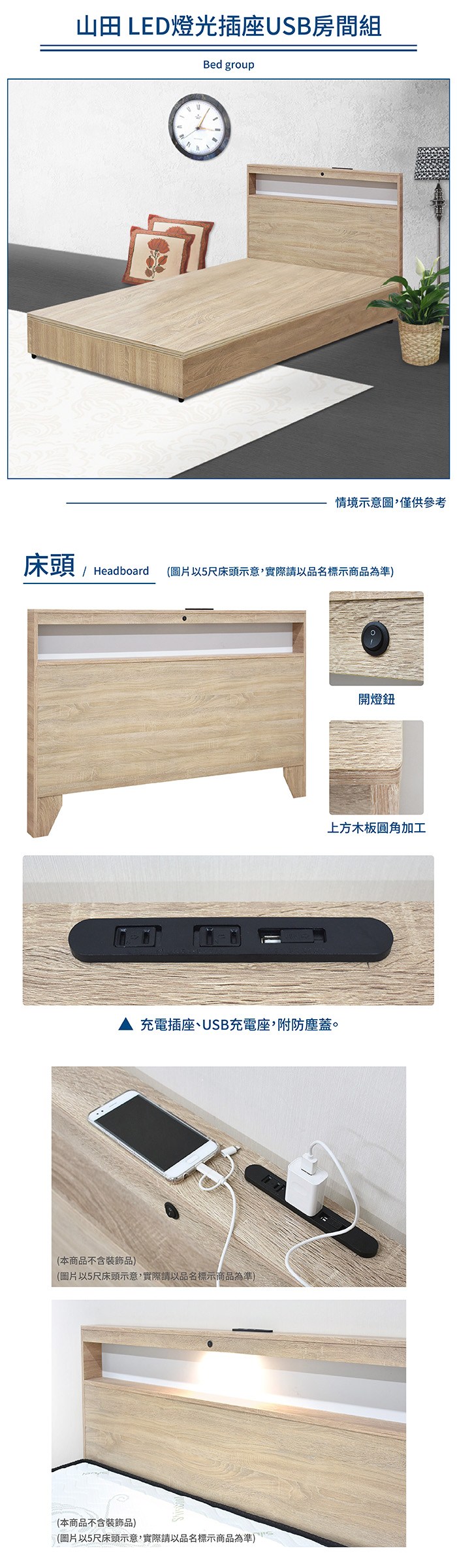 傢俱工場-山田LED插座USB房間2件組(床頭+床底)-雙人5尺古橡