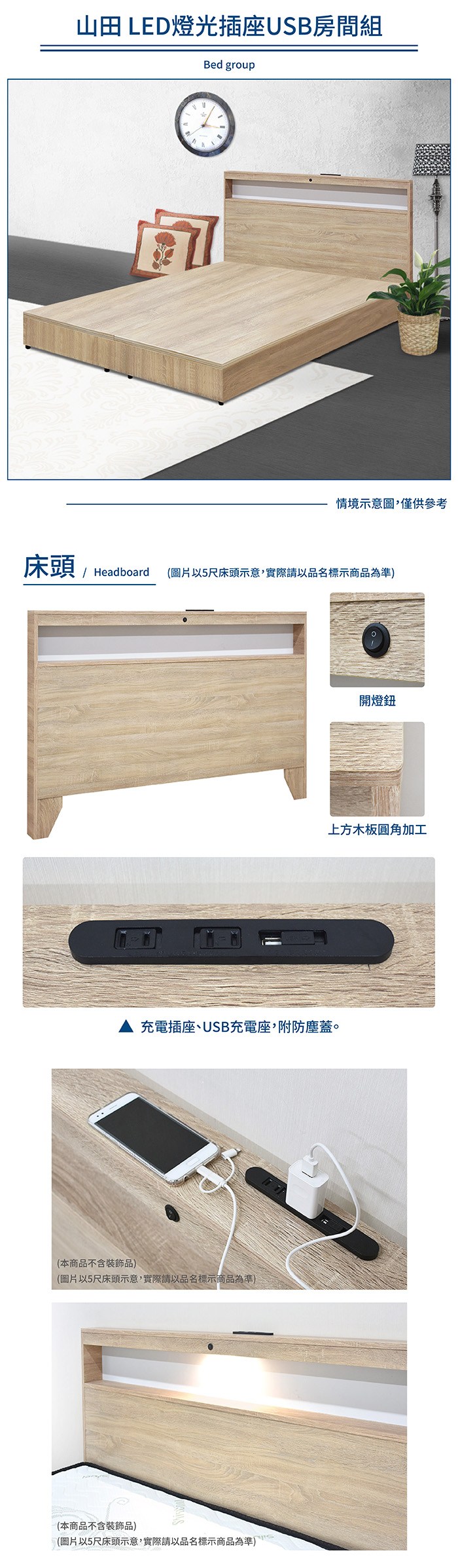 傢俱工場-山田LED插座USB房間2件組(床頭+床底)-雙人5尺古橡