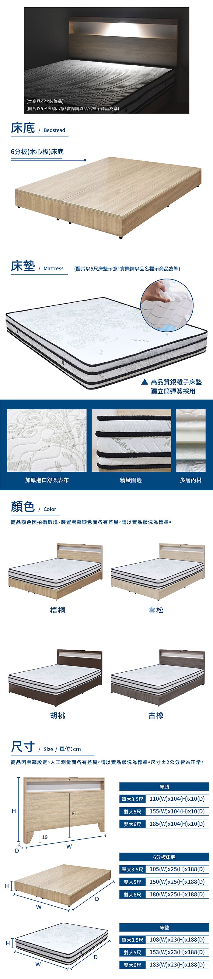 傢俱工場-山田LED+USB房間3件組(床頭+6分底+床墊)雙大6尺梧桐