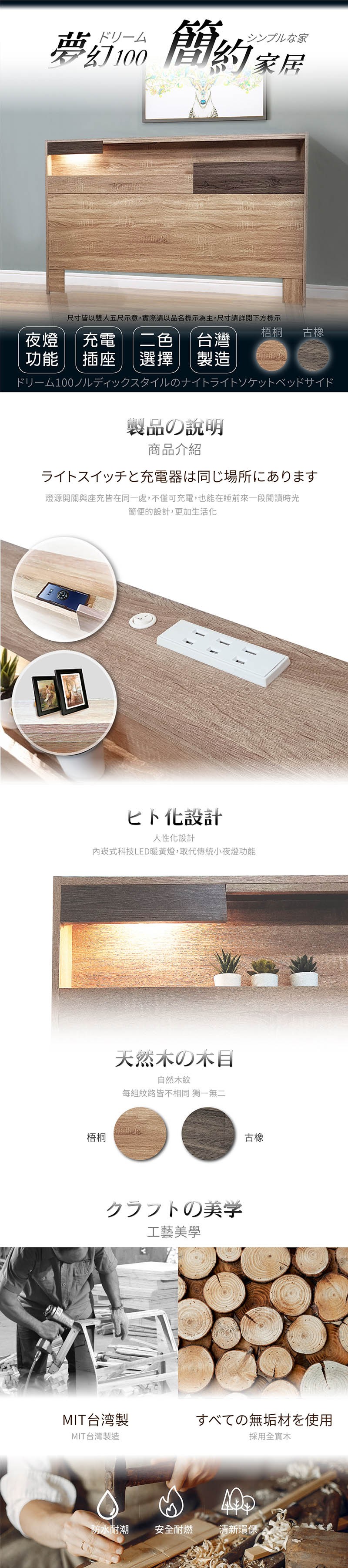 IHouse-夢幻100 北歐風夜燈插座 床片-雙大6尺古橡