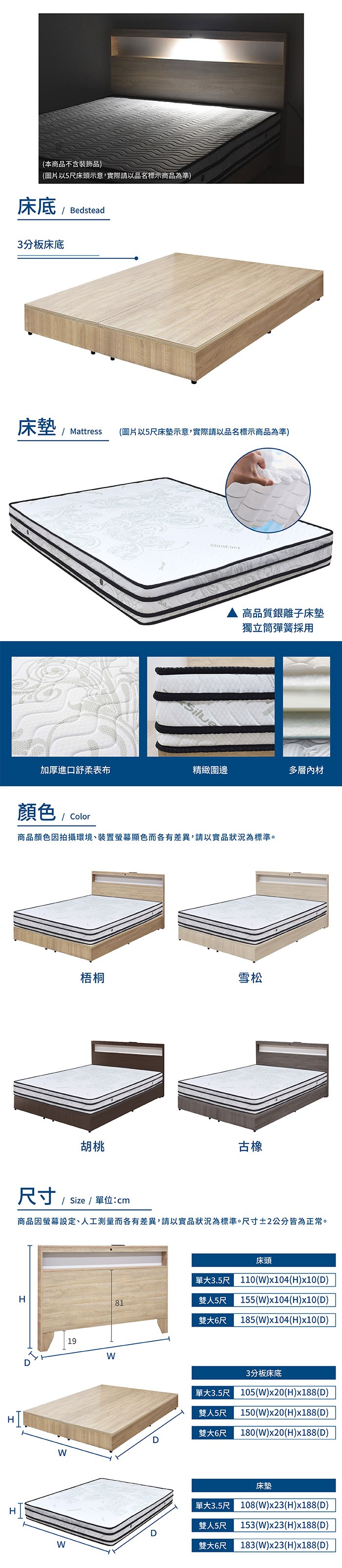 傢俱工場-山田LED+USB3件組(床頭+半封底+床墊)-單大3.5尺梧桐