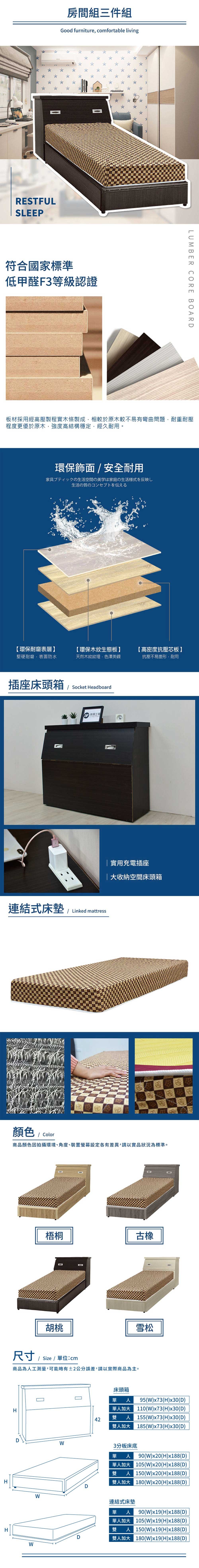 傢俱工場-簡約風 插座房間三件組(床頭+床底+床墊)-單大3.5尺梧桐